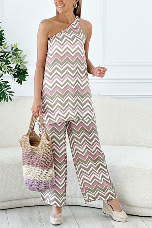 Bellini Brunching Ripple Print One Shoulder Top and Elastic Waist Pocketed Pants Set